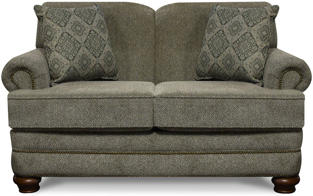 Reed Loveseat features scroll back, rolled arms, nailhead trim and turned bun legs.Read More