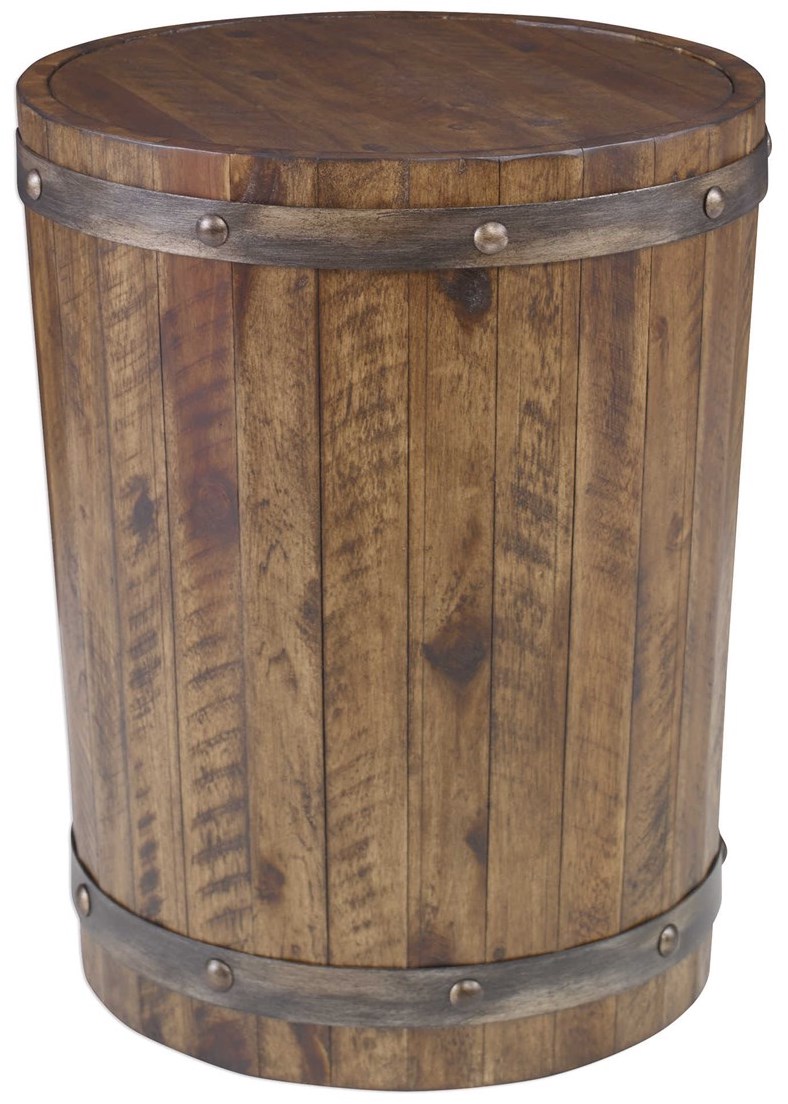 Capturing the essence of an authentic wine barrel, this solid distressed acacia wood piece is finished in a weathered walnut stain, complete with iron sheet metal strapping accented with riveted details in a burnished brushed steel.